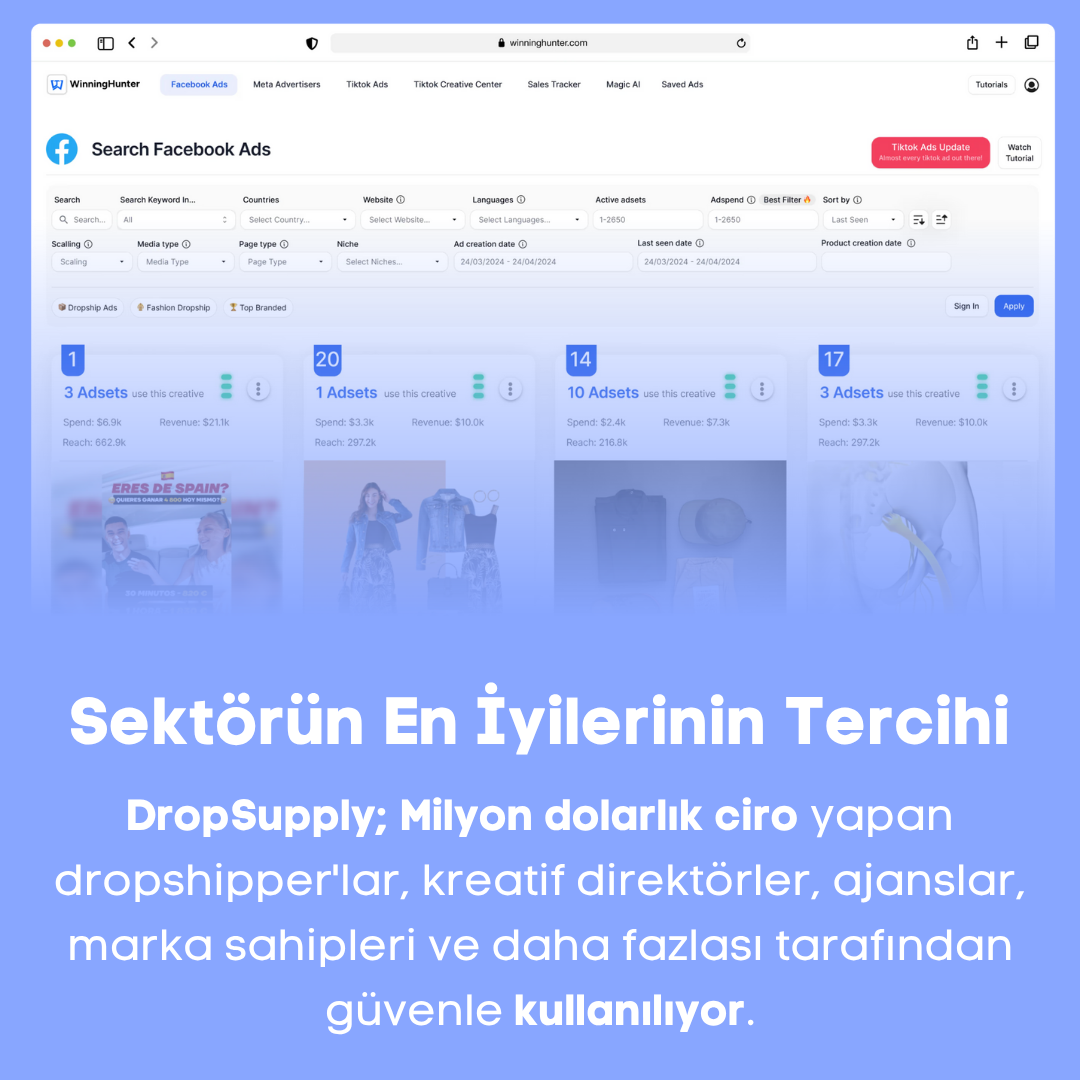 "Ne satsam?" diye düşünmekten yoruldunuz mu? Haftalarca süren "kazanan ürün" avını bitiriyoruz. Winning Hunter'ın devasa reklam kütüphanesi ile binlerce potansiyel trend ürünü, reklam stratejilerini ve rakiplerin cirolarını saniyeler içinde analiz edin. Değerli zamanınızı araştırmaya değil, satış yapmaya harcayın.