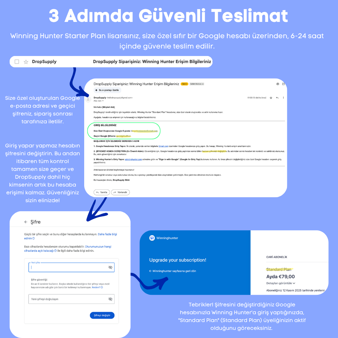Winning Hunter'ın tüm Standard Plan özelliklerine, DropSupply güvencesiyle erişin. Size özel oluşturulan Google hesabı ile tam kontrol sizde. Başarısı kanıtlanmış ürünleri keşfetmeye hemen başlayın.